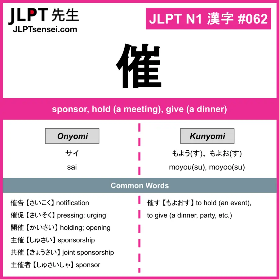 Learn Japanese kanji: 催 【 サイ / もよう(す)、 もよお(す) 】.