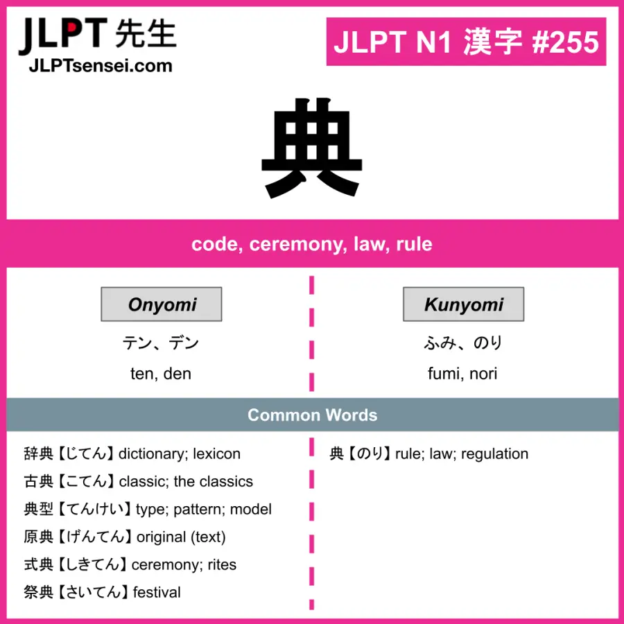 Learn Japanese kanji: 典 【 テン、 デン / ふみ、 のり 】.