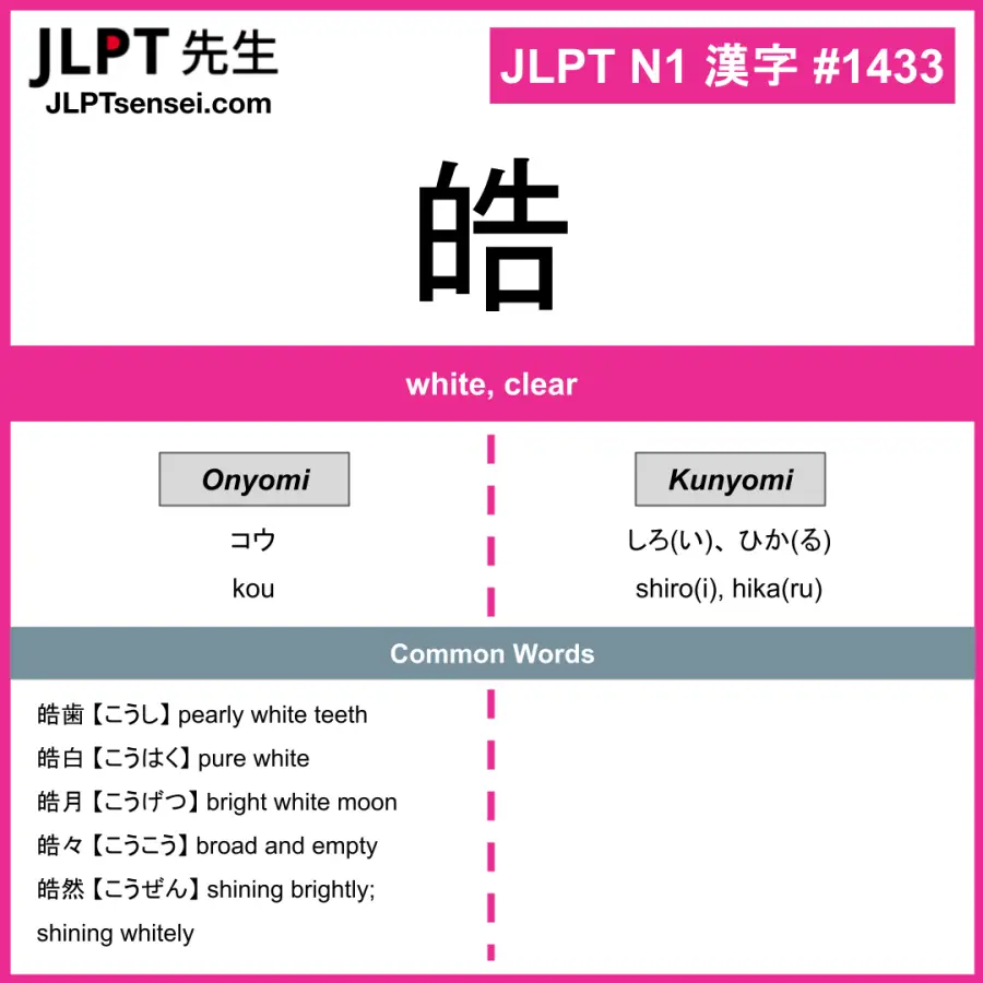 Learn Japanese kanji: 皓 【 コウ / しろ(い)、 ひか(る) 】.