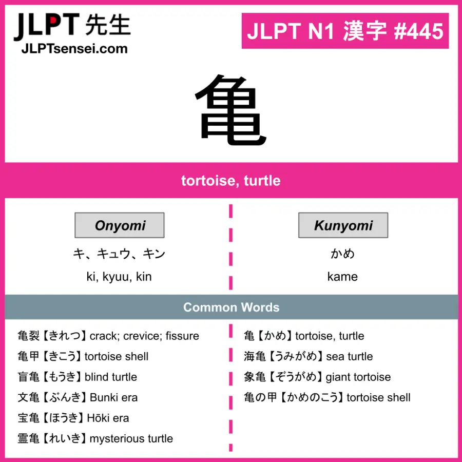 Learn Japanese kanji: 亀 【 キ、 キュウ、 キン / かめ 】.