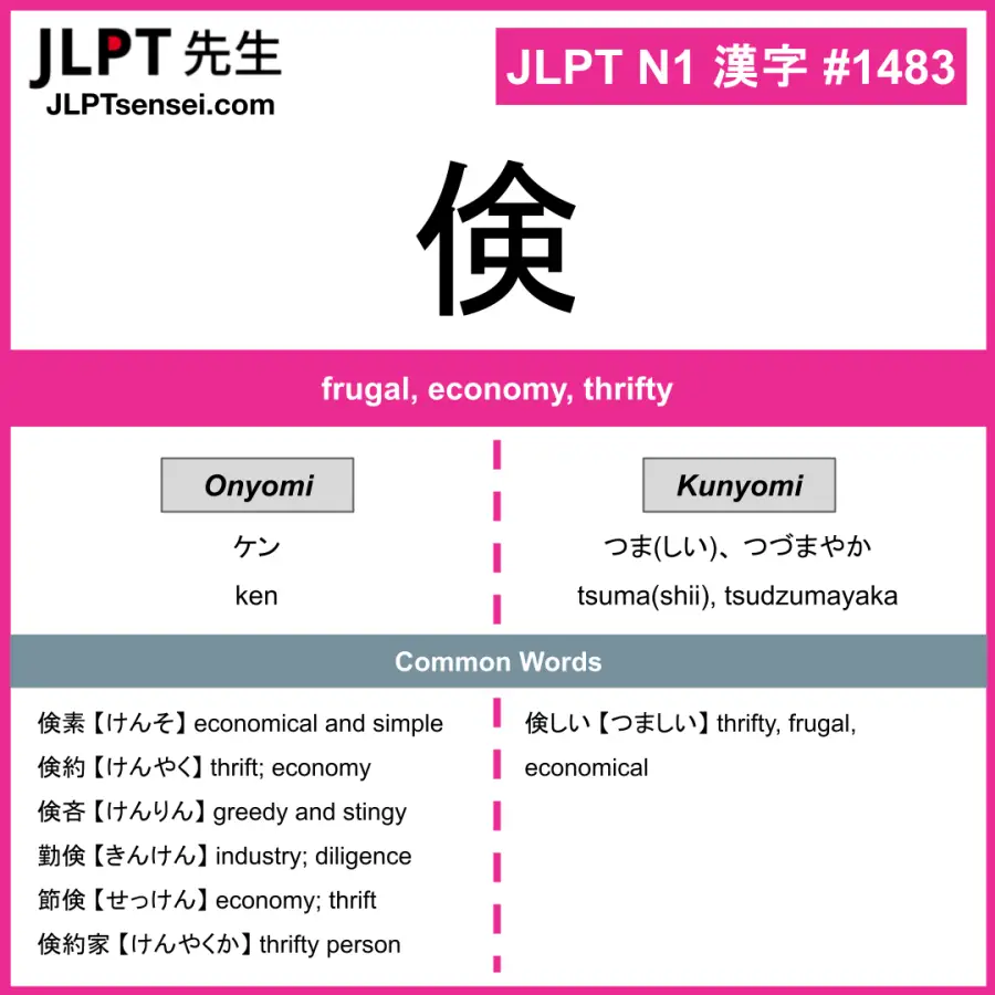 Learn Japanese kanji: 倹 【 ケン / つま(しい)、 つづまやか 】.
