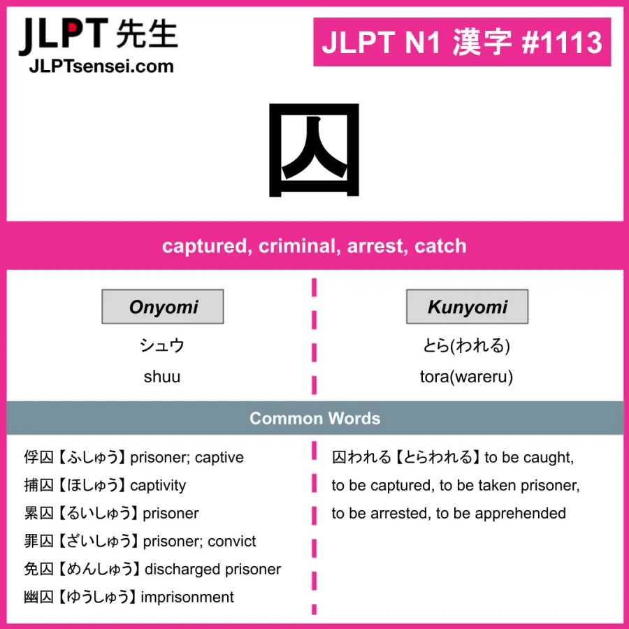 1113 囚 kanji meaning JLPT N1 Kanji Flashcard