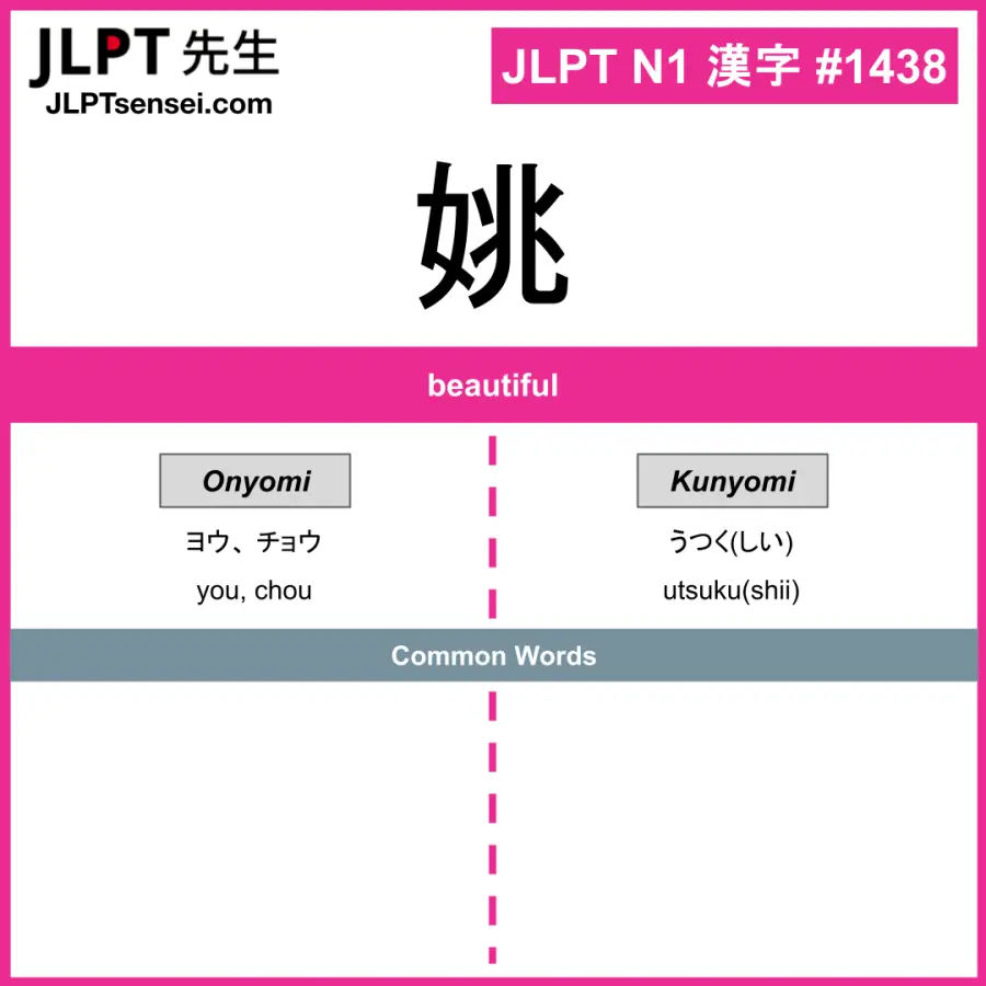 Learn Japanese kanji: 姚 【 ヨウ、 チョウ / うつく(しい) 】.