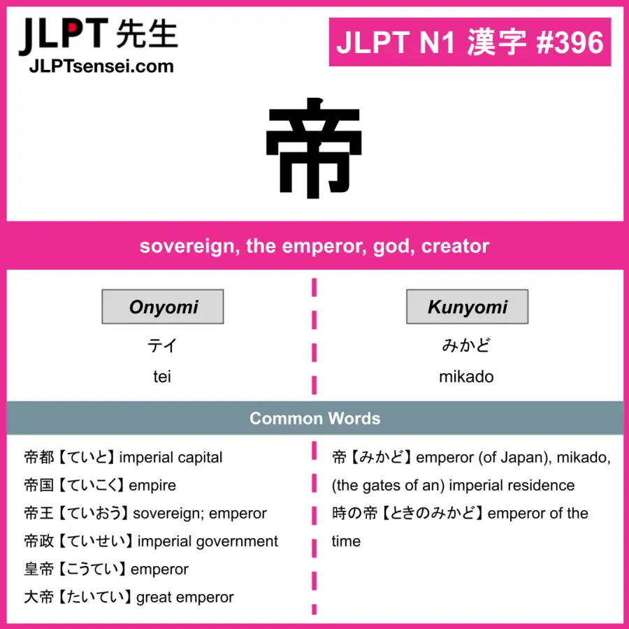 Learn Japanese kanji: 帝 【 テイ / みかど 】.