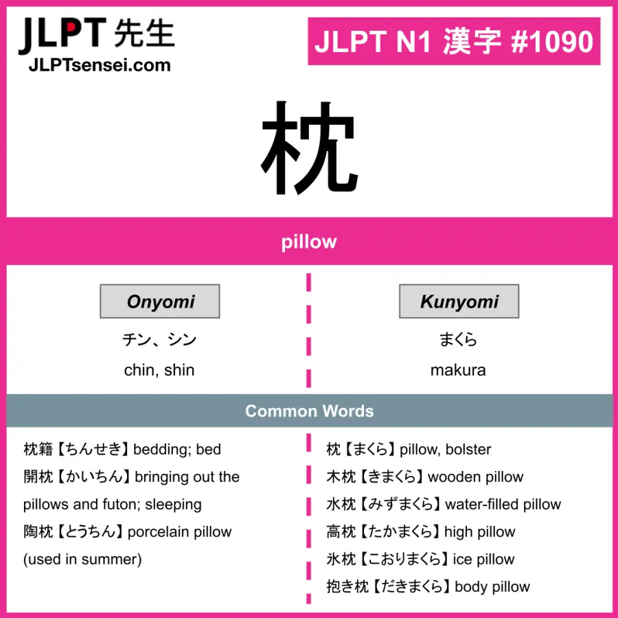 Learn Japanese kanji: 枕 【 チン、 シン / まくら 】.