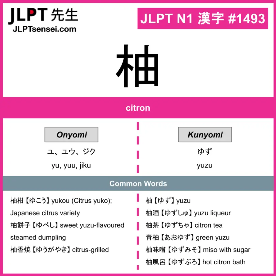 Learn Japanese kanji: 柚 【 ユ、 ユウ、 ジク / ゆず 】.