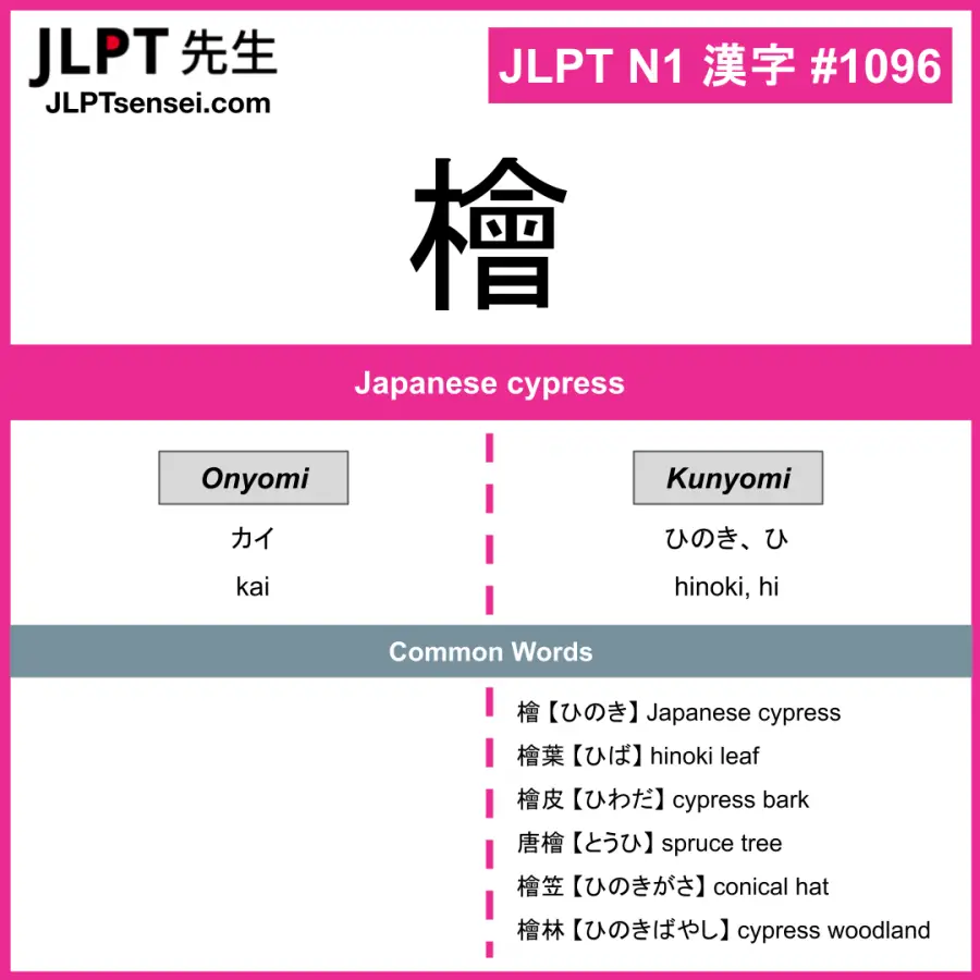 Learn Japanese kanji: 檜 【 カイ / ひのき、 ひ 】.