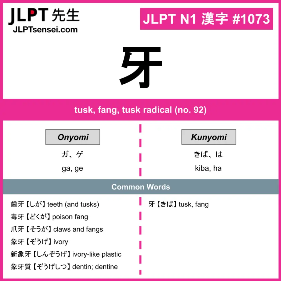 Learn Japanese kanji: 牙 【 ガ、 ゲ / きば、 は 】.