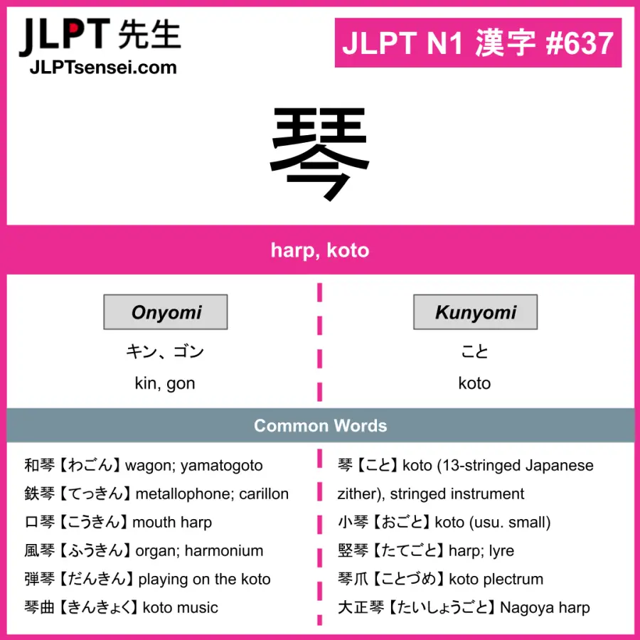 Learn Japanese kanji: 琴 【 キン、 ゴン / こと 】.