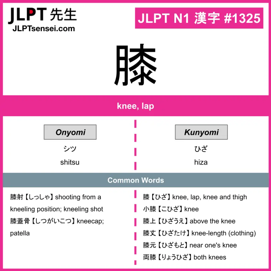 Learn Japanese kanji: 膝 【 シツ / ひざ 】.
