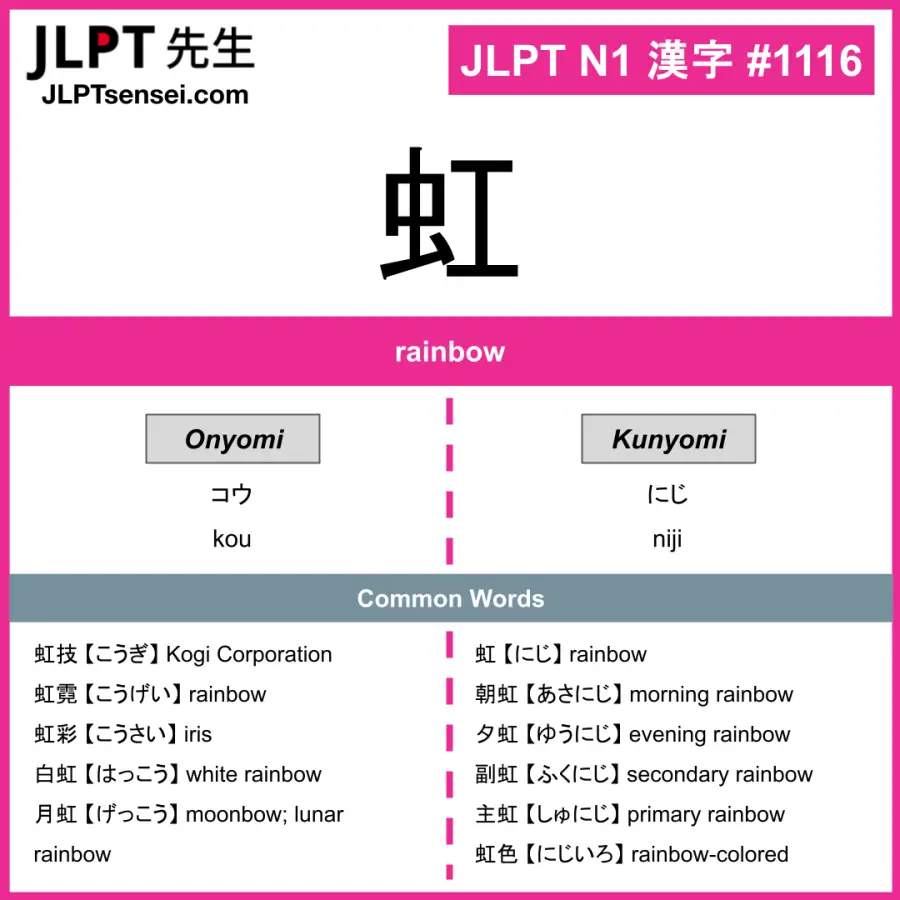 Learn Japanese kanji: 虹 【 コウ / にじ 】.
