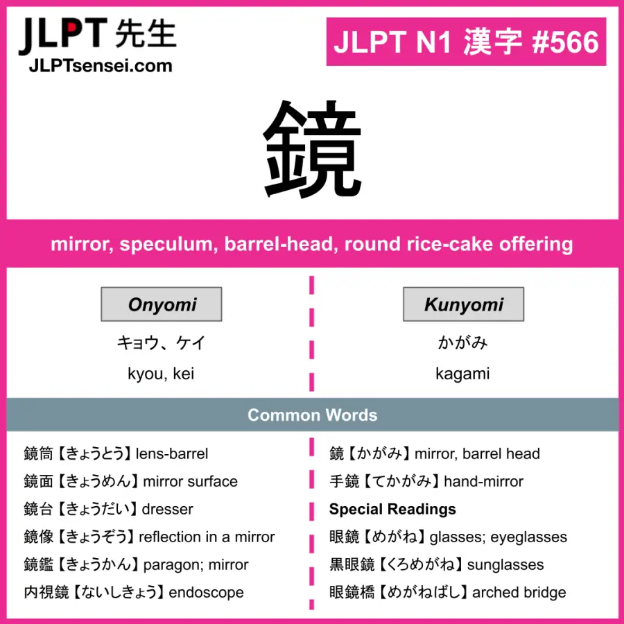 Learn Japanese kanji: 鏡 【 キョウ、 ケイ / かがみ 】.